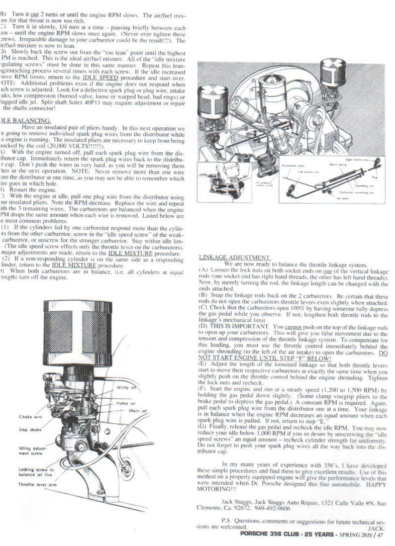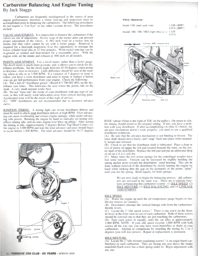 Jack Staggs' two-page article covers carburetor balancing and engine tuning for the Porsche 356. Click the images below to view the full article.