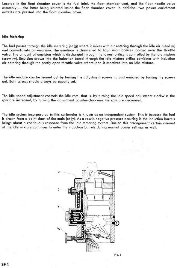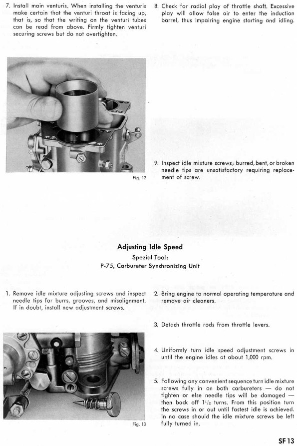 Solid shaft: Turn the idle speed screw back (counter clockwise) on each carb until the idle speed drops to around 900–1000 RPM. Check each throat with the Uni-syn to balance the flow through each side. Pop one of the vertical drop rods off of the throttle linkage so that it does not influence the other carb. Then, begin slowly turning in (clockwise) one of the idle mixture screws. The idle speed will generally begin to rise and then begin to drop. As soon as you detect this drop, stop and back the screw out until it is at its best idle speed. Go the next one and do the same. It may be necessary to go through this procedure several times until a smooth steady idle is achieved at around 900–1000 RPM. Reconnect the throttle drop rod and adjust it, if necessary, so that it does not influence the idle speed, then rev the engine a couple of times and observe how it comes back to idle.
